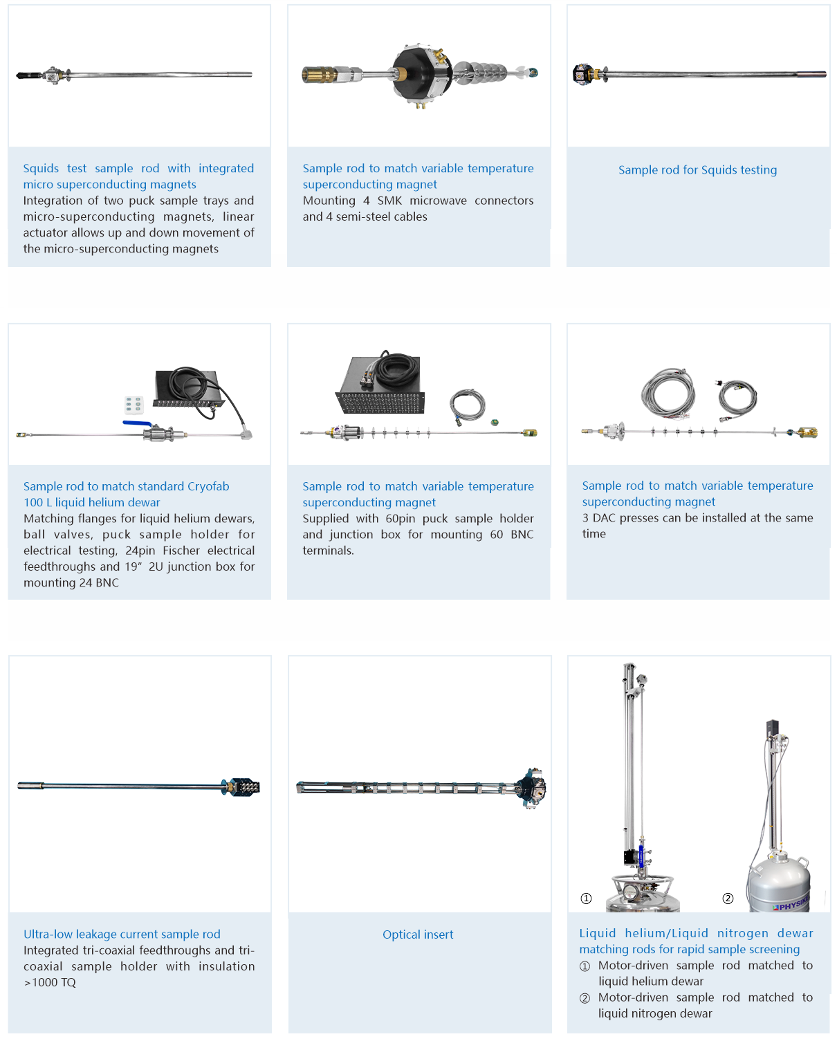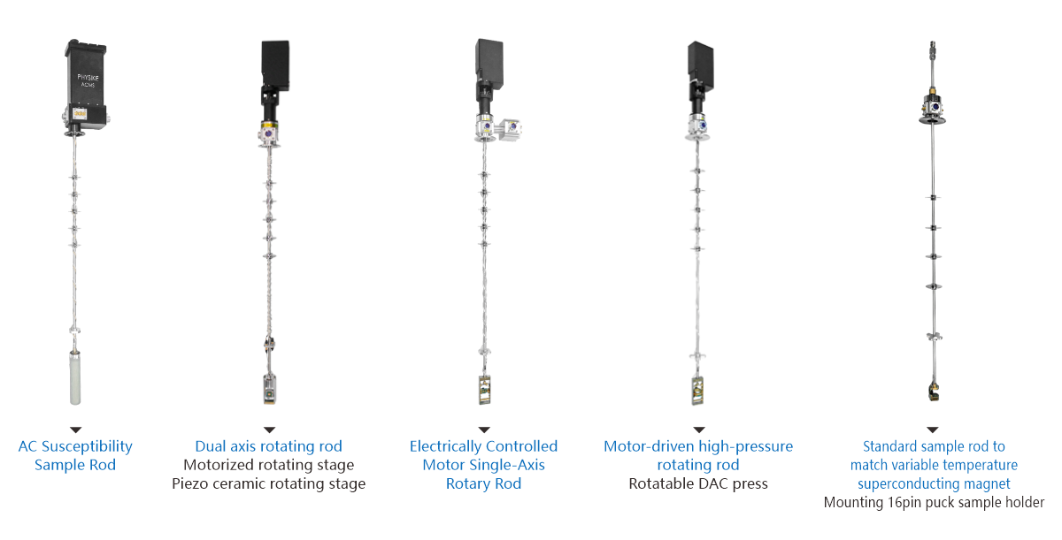 Physike offers a wide range of cryogenic test sample rods, such as single/dual axis rotating rods, AC magnetic susceptibility rods, test rods matched to liquid helium/liquid nitrogen dewars, Squids device test rods, etc., which can be customized upon request.