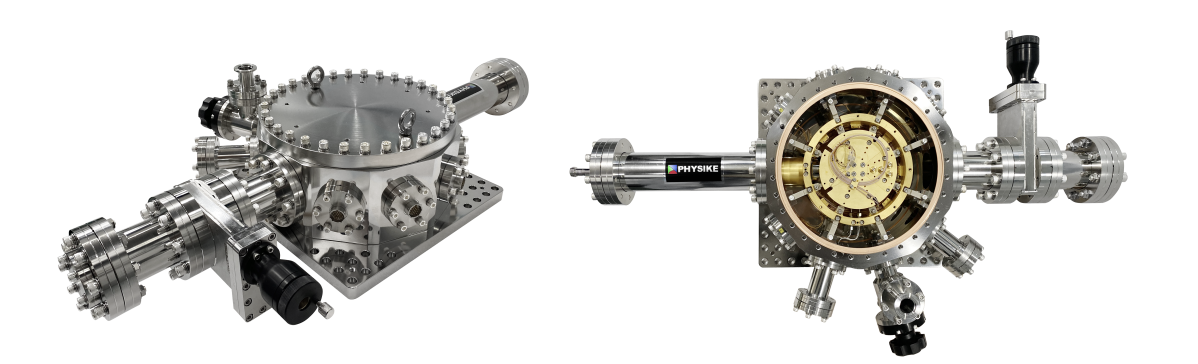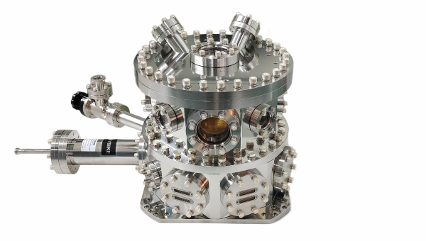 Below is the Qcryo-S-200 dry UHV-compatible cryogenic chamber for ion trap experiments, which can be baked to over 150°C, has an integrated upper vacuum chamber and provides eight side windows and three top windows on the upper vacuum chamber, provides UHV-compatible multi-pin connectors and RF vacuum feedthroughs, and is supplied with 200 DC cryogenic wires and four RF cryogenic cables.