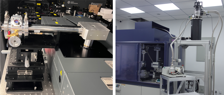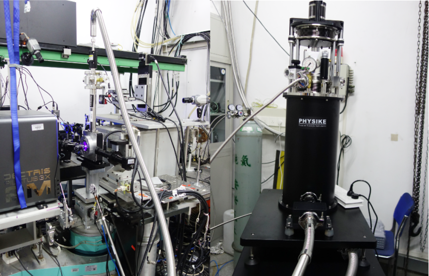 The high-pressure and low-temperature system (Qcryo-S-300) matched with Rigaku NANOPIX WE X-ray diffractometer integrates a diamond anvil cell and a dual gas membrane in-situ pressure regulating mechanism, with a minimum temperature of less than 2.5K.(right )