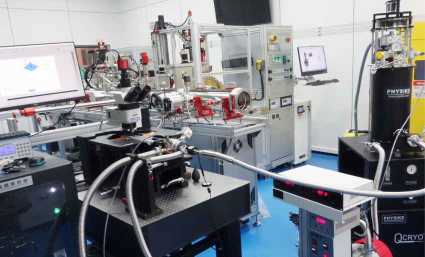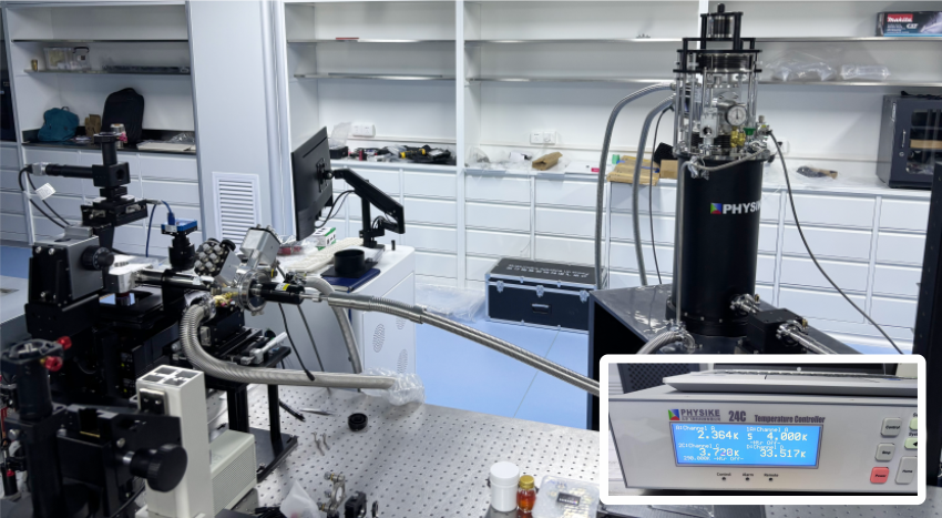 Dry closed-loop microcryogenic system (Qcryo-S-300), matched with magneto-optical Kerr micro-imaging system, for magneto-optical Kerr micro-imaging tests and magnetic domain inversion tests at low temperatures, the lowest temperature:<2.5k.